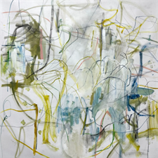 As the show’s title suggests, Arora does not plan her paintings ahead of time, instead seeing where her process takes her. Discussing her approach, she says, “it’s a conversation on the canvas that is sometimes wild, rebellious, mostly casual, half-organized and always well structured. I go for unexpected marks, awkward color palettes, and a composition that’s off-centered but balanced.” She finds tremendous value in this method, explaining that the “off the cuff” nature of the work “give the paintings life.”